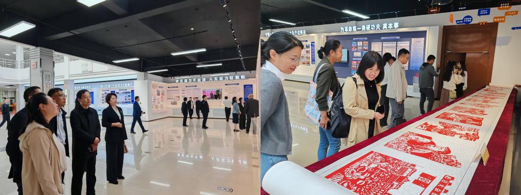 法学院教师引领并陪同校友们参观图书馆一楼的校史展、美术展、油陶馆,在一幅幅珍贵的历史照片、一件件实物展品前驻足观看,在美术作品中感受校园文化的深厚底蕴。校友们不时回忆起自己在校求学的美好时光,感慨学校发展之快、变化之大。