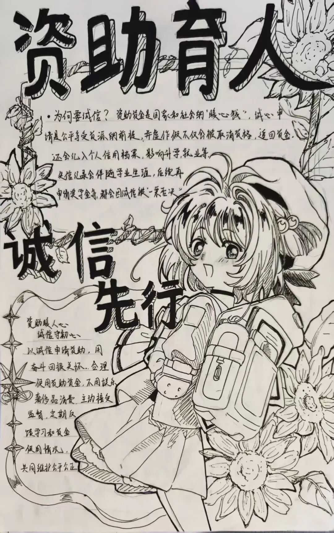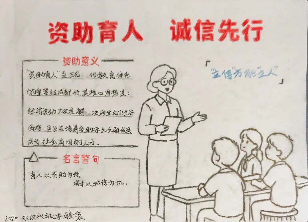 为深化资助育人成效,引导学生树立诚信意识,10月20日,法学院围绕“资助育人,诚信先行”主题举办手抄报设计活动,以手绘创作形式传递诚信价值,筑牢学生诚信品格根基。