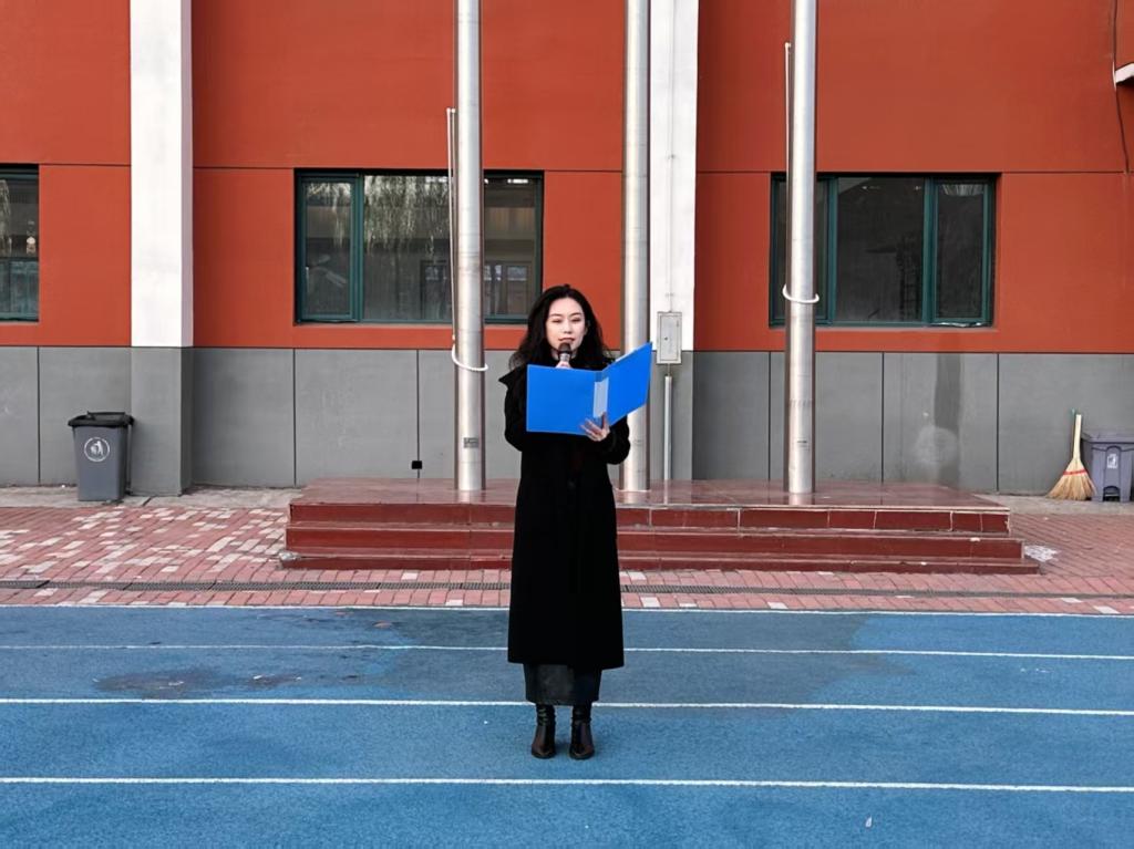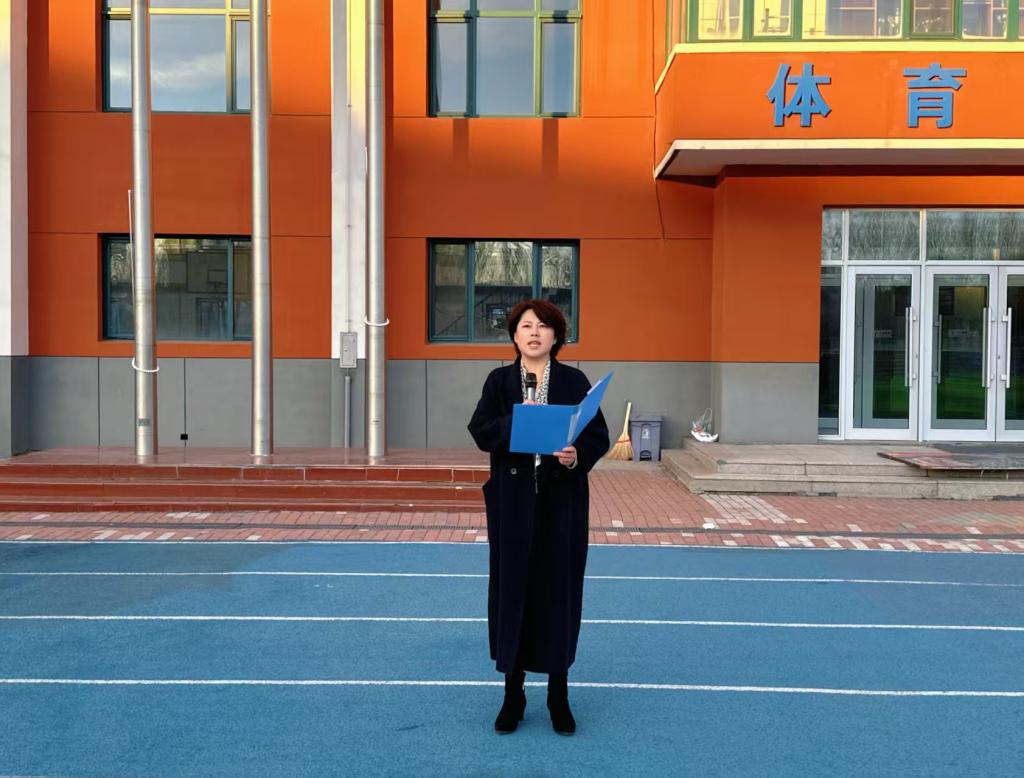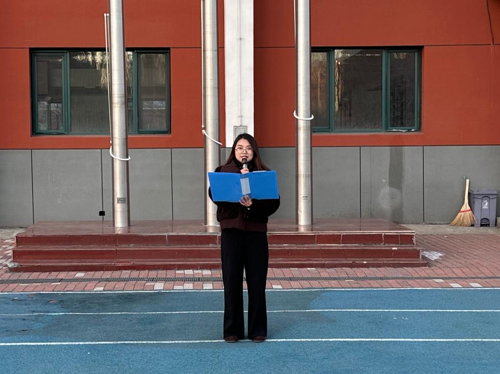 晨光微熹,国旗护卫队步伐铿锵,护送五星红旗庄严入场。在雄壮激昂的国歌声中,全体师生肃立行注目礼,注视着国旗冉冉升起。升旗仪式后,学生代表姚佳琪登台发言,她结合铁人王进喜的感人事迹与法学专业特点,向全体同学发出号召:“将铁人的坚韧奋斗,融入法治的严谨细致。”随后,在王洪博同学的带领下,全体学生高举右拳,庄严宣誓。铿锵有力的誓言回荡在体育场上空,彰显了同学们砥砺意志、刻苦学习、奉献法治事业的坚定决心。