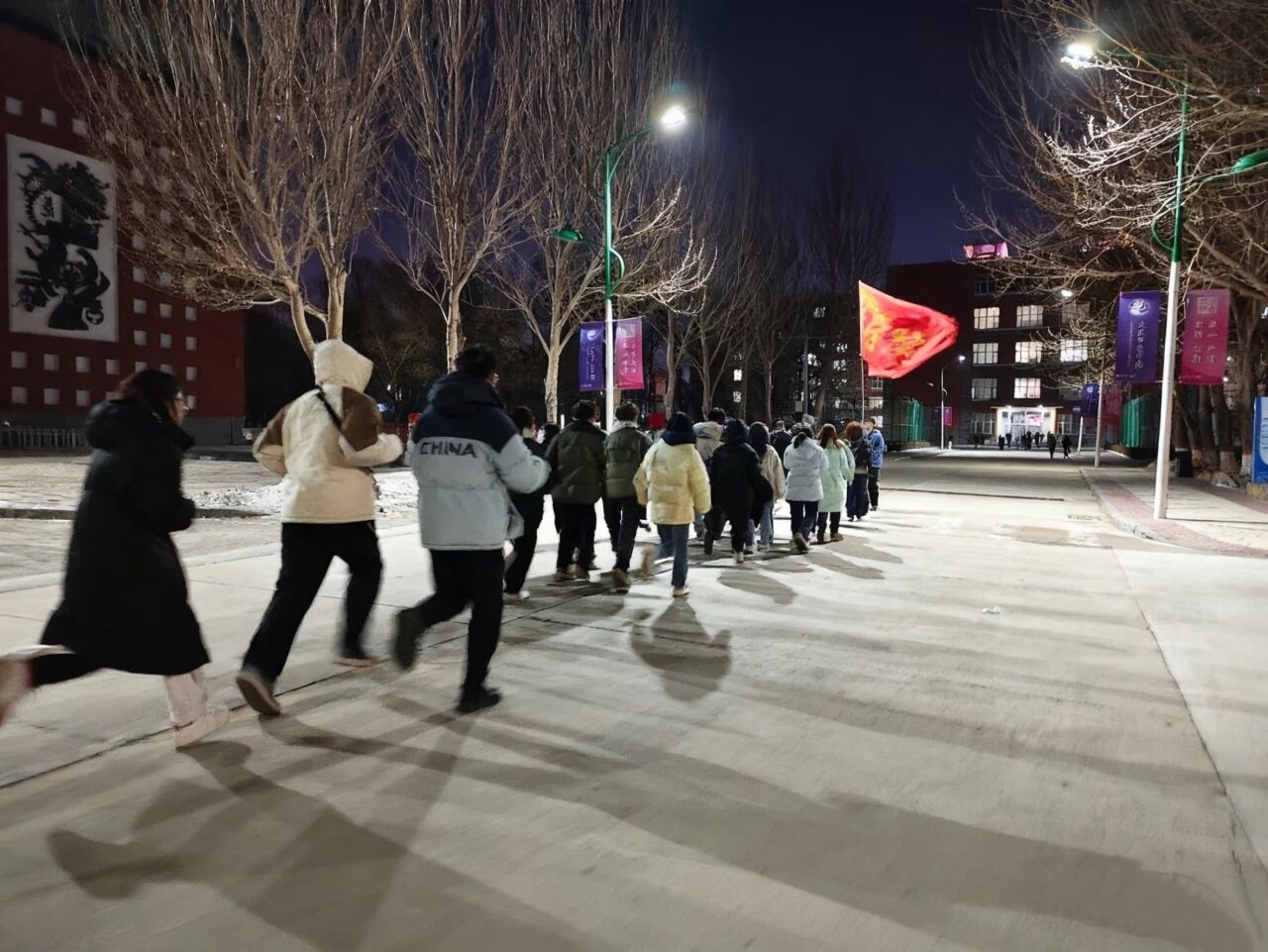 活动伊始,辅导员陶雨朝老师向同学们说明了夜跑路线、活动规则与安全注意事项,并深刻阐释了此次活动的意义与主旨,鼓励同学们以此次夜跑为起点,养成坚持锻炼的良好习惯,将铁人精神内化于心、外化于行。随后,同学们整齐列队,在领跑员的带领下有序出发,步履一致,青年的英姿在路灯与月光下光影交织,也给校园夜景添了几分色彩。