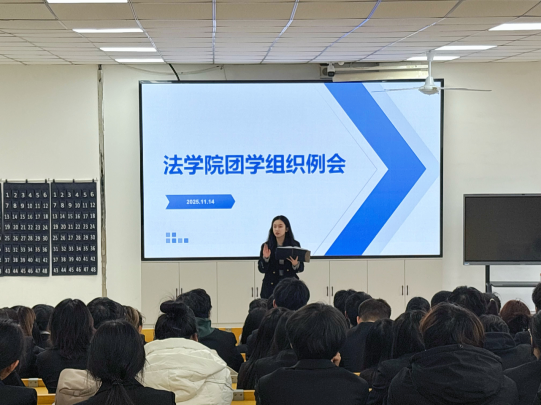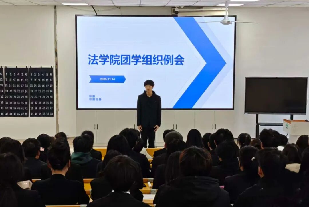 2025年11月14日法学院团学组织例会在主楼2-1顺利举行。团委书记杨郁婷、副处级辅导员关陟平、辅导员陶雨朝出席,法学院学生会全体成员参会。