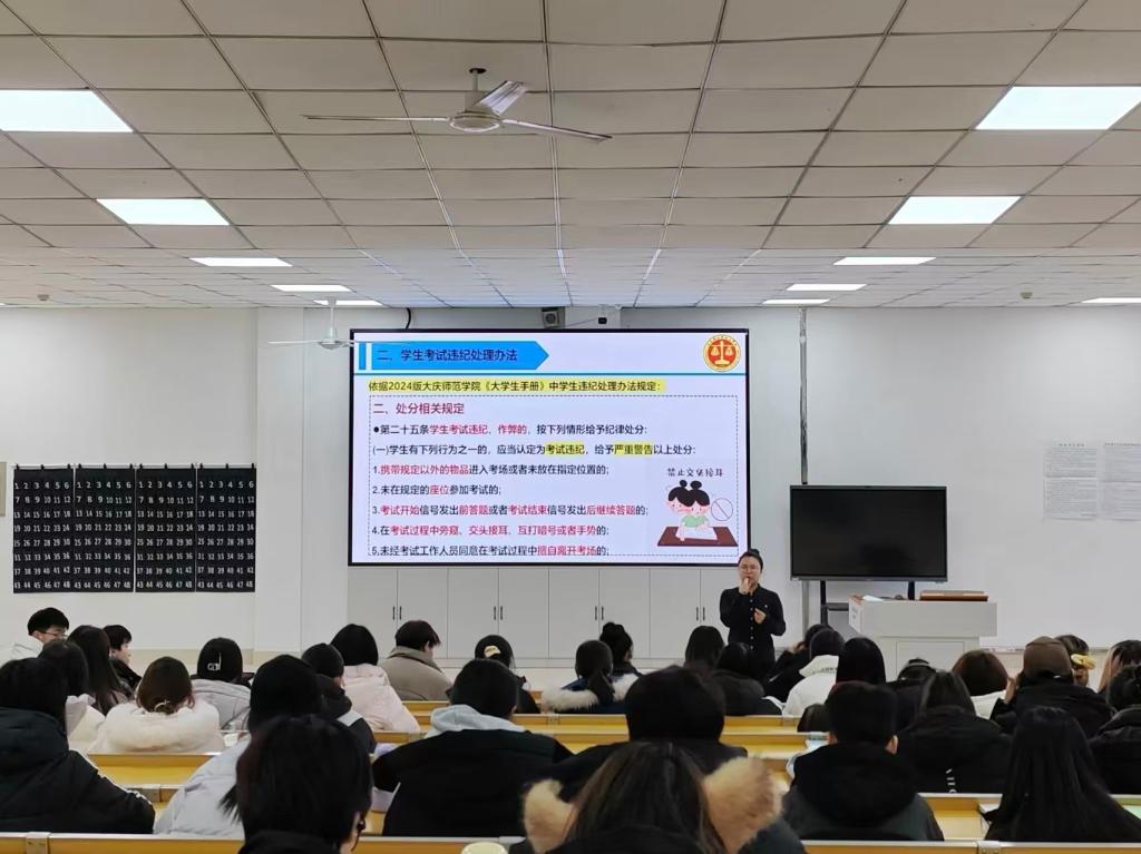会上,陶雨朝老师向同学们讲明了诚实守信的重要意义,强调了考试纪律与规章制度的严肃性,带领同学们共同学习《大学生手册》中关于考试违纪、作弊的纪律处分相关规定,并组织全体学生签署考试承诺书,确保每一位同学清晰知晓考试要求和考场秩序。陶老师勉励同学们以积极的态度投入复习备考,科学规划时间、合理统筹进度,以诚信应考的实际行动展现自身实力,共同维护风清气正的考试环境,筑牢优良学风根基。