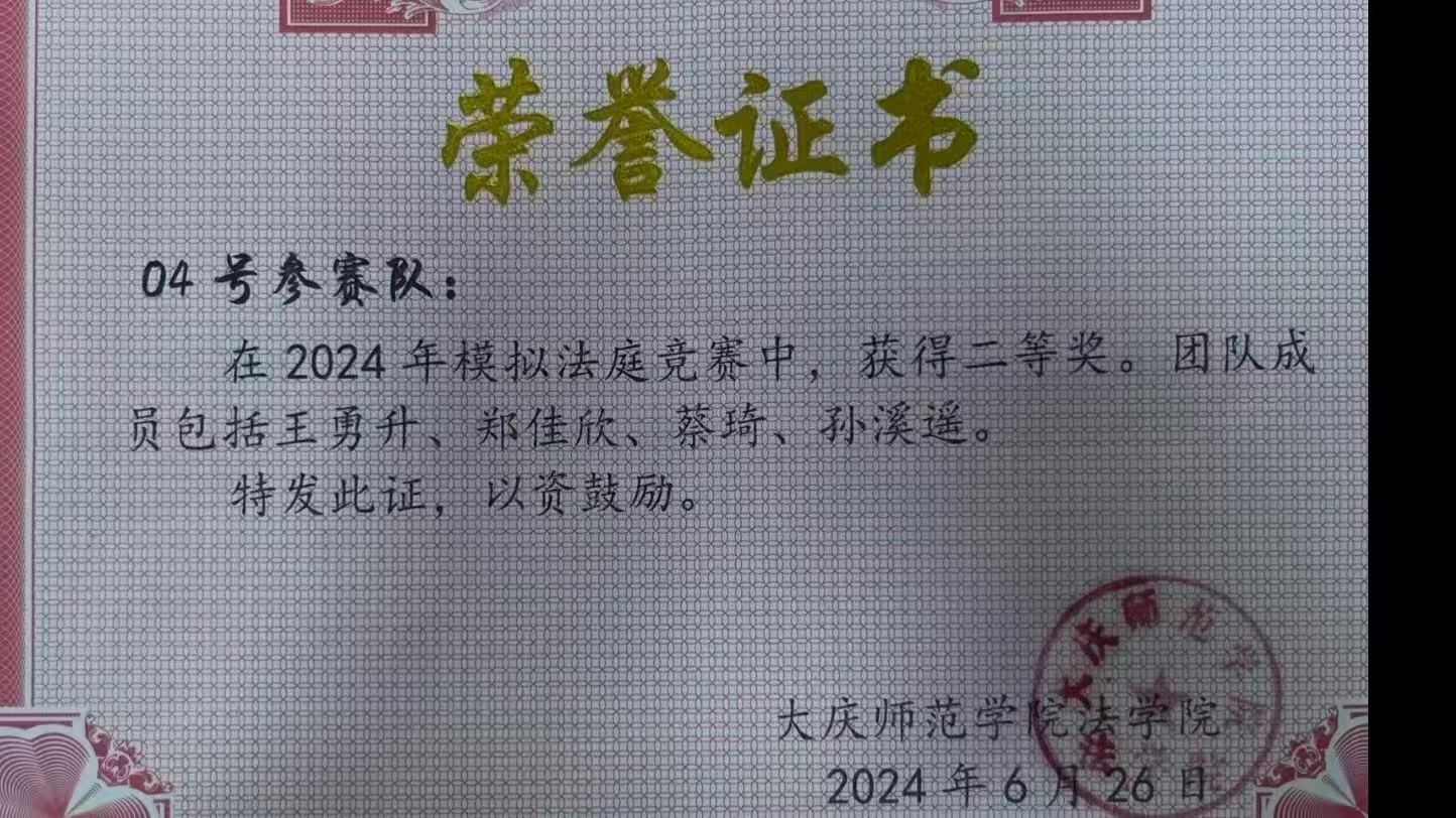 蔡琦,法学院2022级法学一班学生,在校期间成绩优异,始终保持严谨踏实的学习态度,大学期间学习成绩一直在专业前4名,三年总成绩位列专业第一名,并连续三年获得校级二等奖学金。曾获2024年模拟法庭辩论赛团体第二名,已通过大学英语四、六级考试。参加2026年研究生考试,取得350分,被辽宁大学法学院法律(法学)专业拟录取。