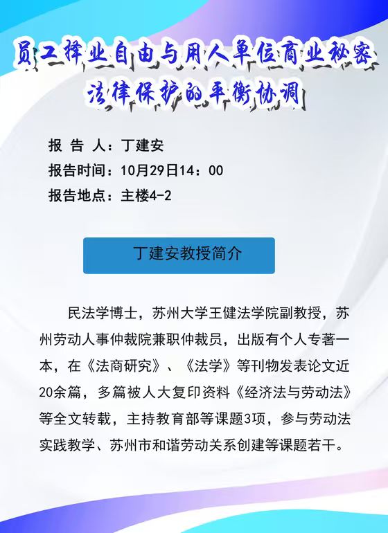 讲座通知 | 员工择业自由与用人单位商业秘密法律保护的平衡协调——丁建安