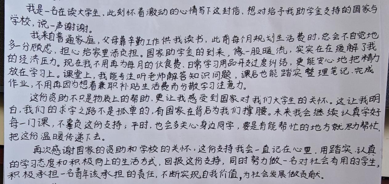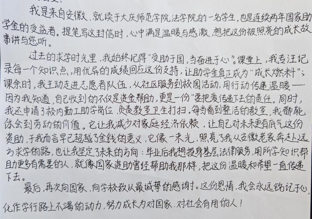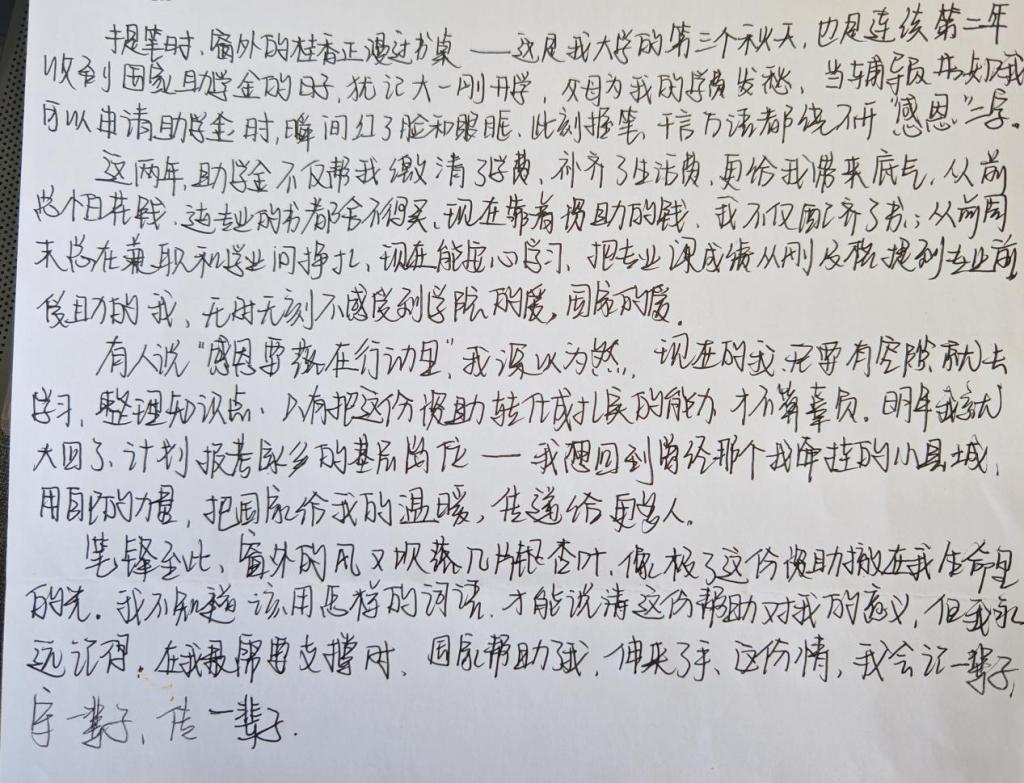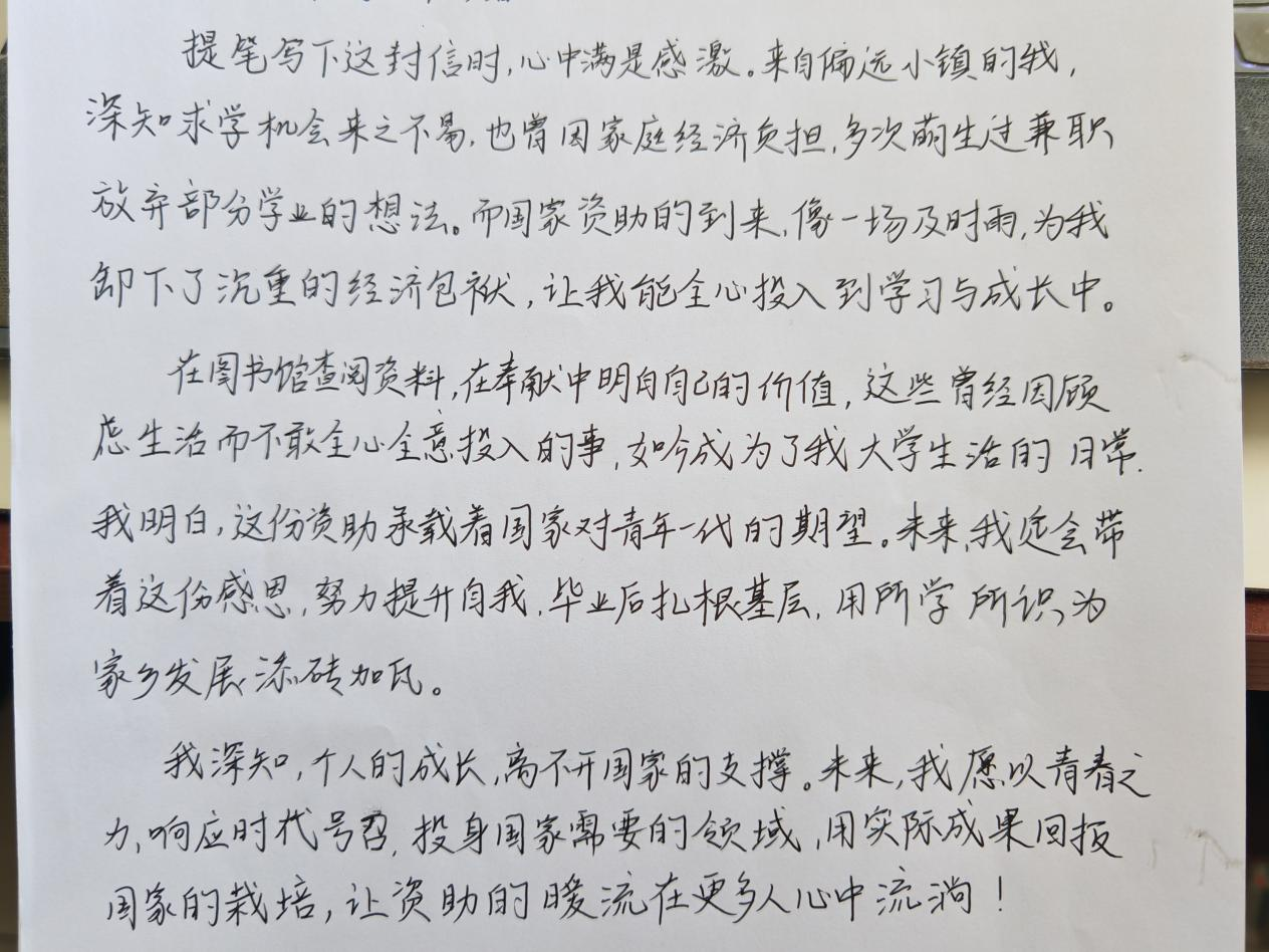 为深化资助育人成效,培育学生的感恩意识与社会责任感,法学院于9月30日举办“感恩信笺”主题活动,同学们将无形的感激化为有形的文字,表达了对国家资助政策的深深感恩。