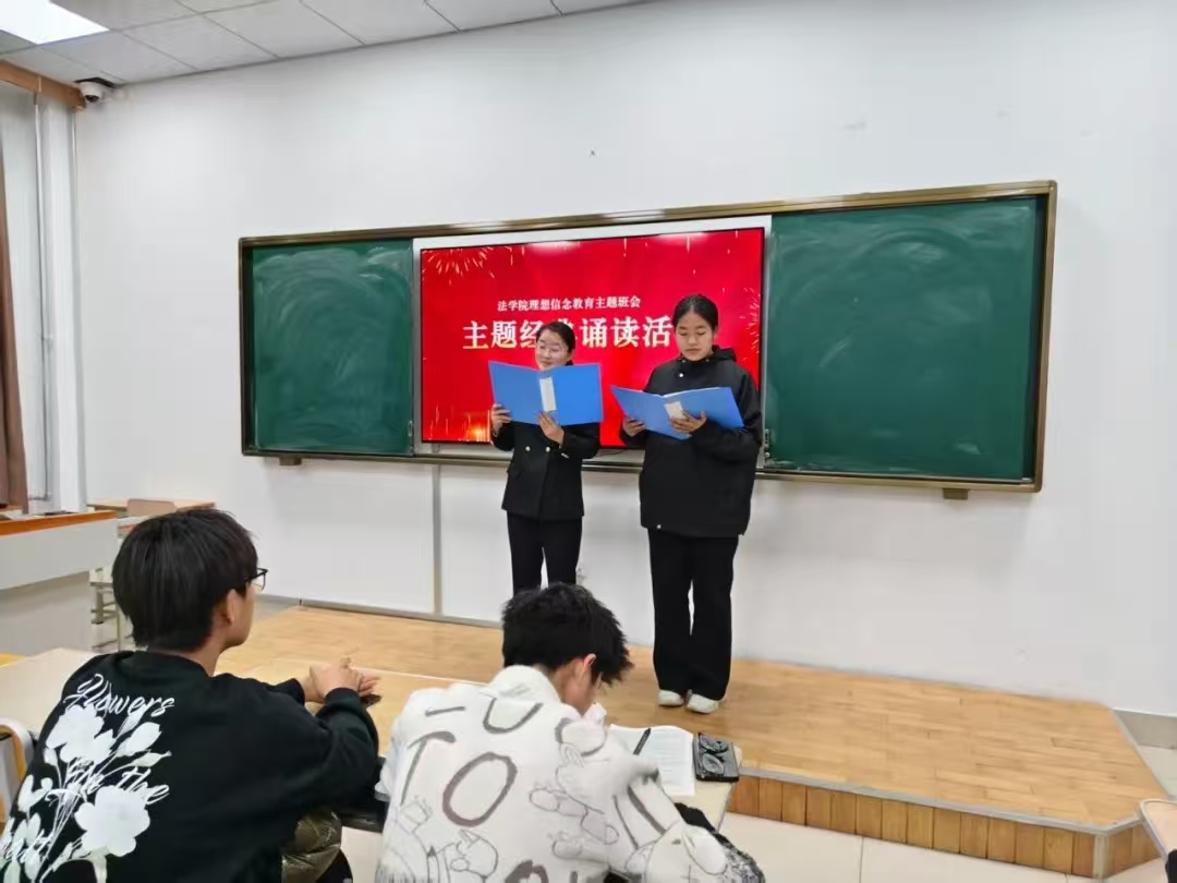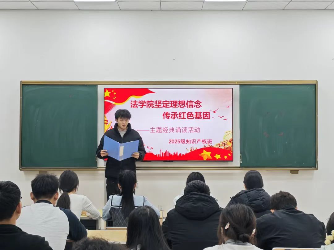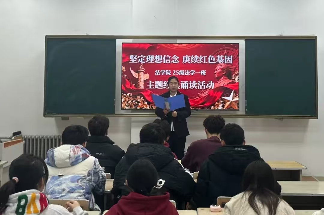 在“坚定理想信念 传承红色基因”主题诵读会上,同学们以红色历史为脉络、以理想信念为内核,精心演绎原创朗诵作品。诵读中,学子们或激昂回溯革命征程,或深情诠释法治初心,声情并茂传递赤诚信仰,让红色精神与时代呼唤同频共振。本次活动不仅锤炼了学生的思辨与表达能力,更助力红色教育入脑入心。