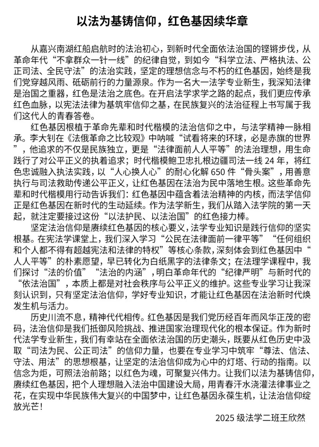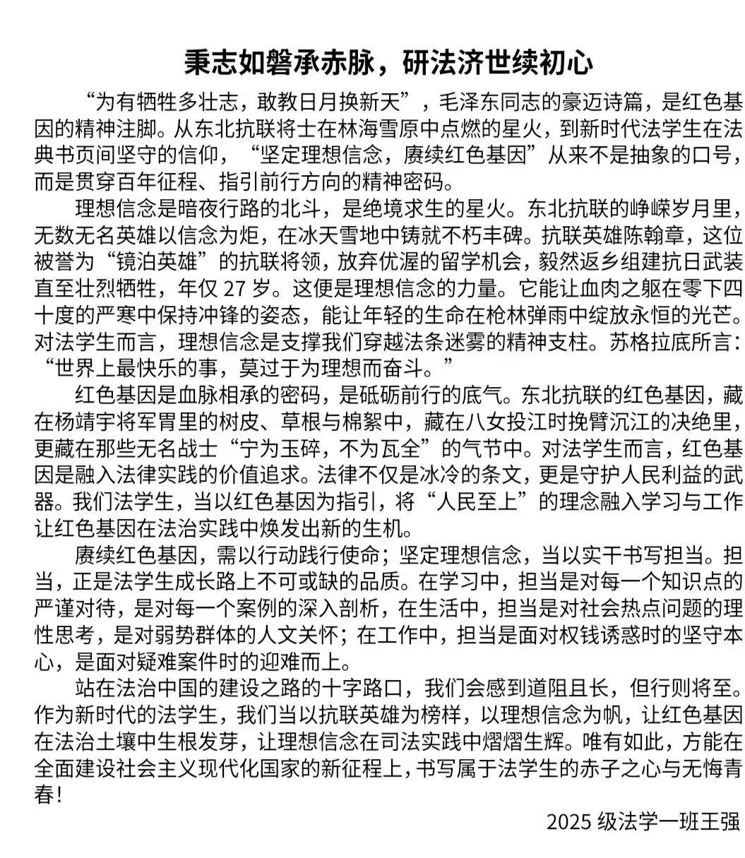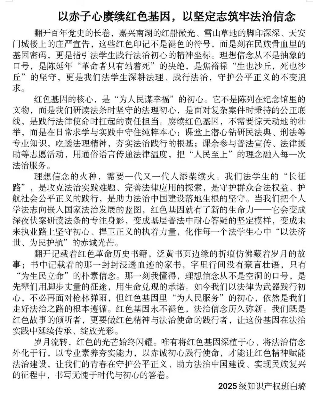 为鼓励同学们深入思考,法学院同步开展了主题征文活动。引导广大学生围绕“坚定理想信念,传承红色基因”这一主题,结合自身学习、生活实际以及对专业的理解,踊跃投稿,充分展现了法学院青年学子将个人成长融入国家发展的自觉追求与坚定决心。